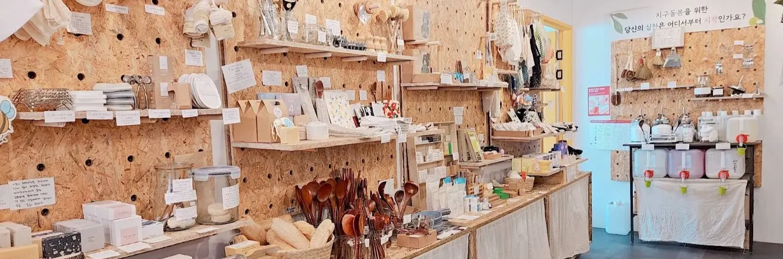 쓰레기를 제로로 만들기 위해 일회용품, 플라스틱, 비닐포장 등이 없는 물품으로 소비를 전환할 수 있는 가게입니다.