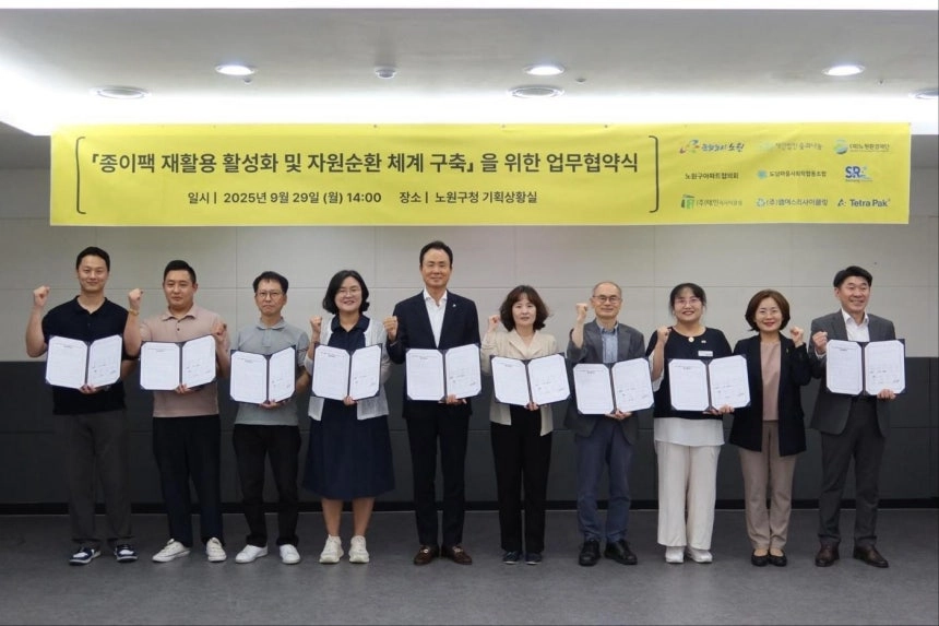 (서울=뉴스1) 이재상 기자 = 글로벌 식품 전처리 및 포장 기술 선도 기업 테트라팩 코리아가 지난 29일 노원구를 비롯해 총 9개 기관이 함께 '종이팩 재활용 활성화 및 자원순환 체계 구축을 위한 업무협약(MOU)'을 체결했다고 밝혔다.