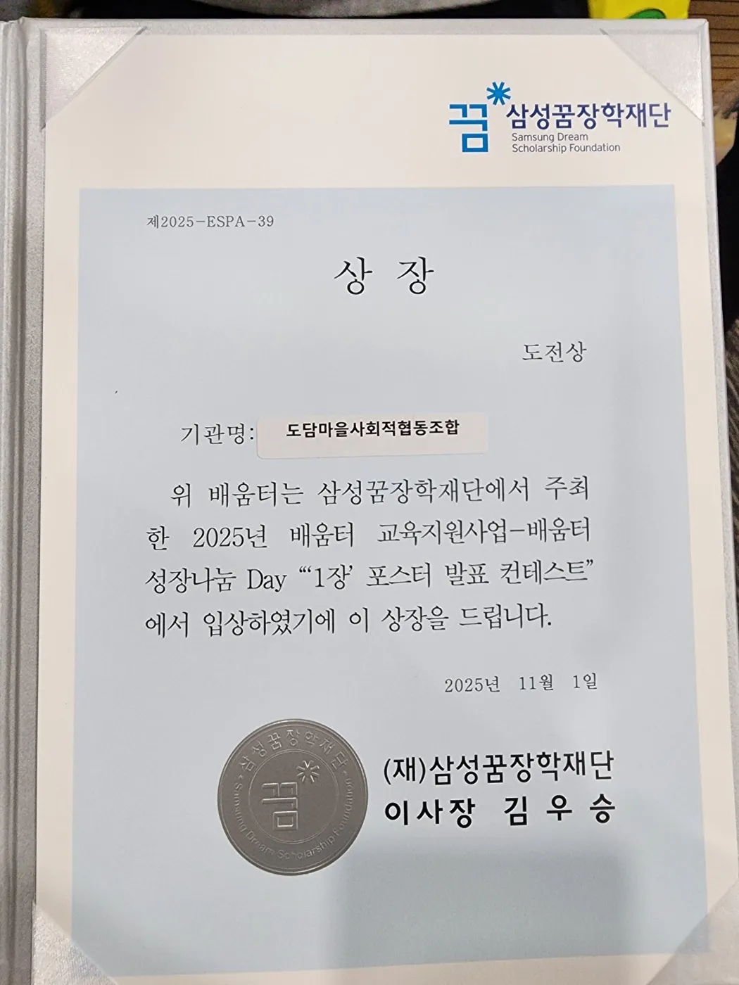 “삼성꿈장학재단의 성장나눔DAY” 행사가 하이서울유스호스텔에서 10:30~17:00까지 열렸답니다. 이번 행사에서는 1칸 부스소개, 1장 포스터 발표, 청소년 창작곡 밴드 페스티벌, 배움터 교사 사례나눔, 배움터 장학생 봉사대회, 수학을 부탁해!컨테스트, 과학. SW-AI프로젝트 결과 발표회까지 다양한 행사가 시간대별로 열렸답니다.