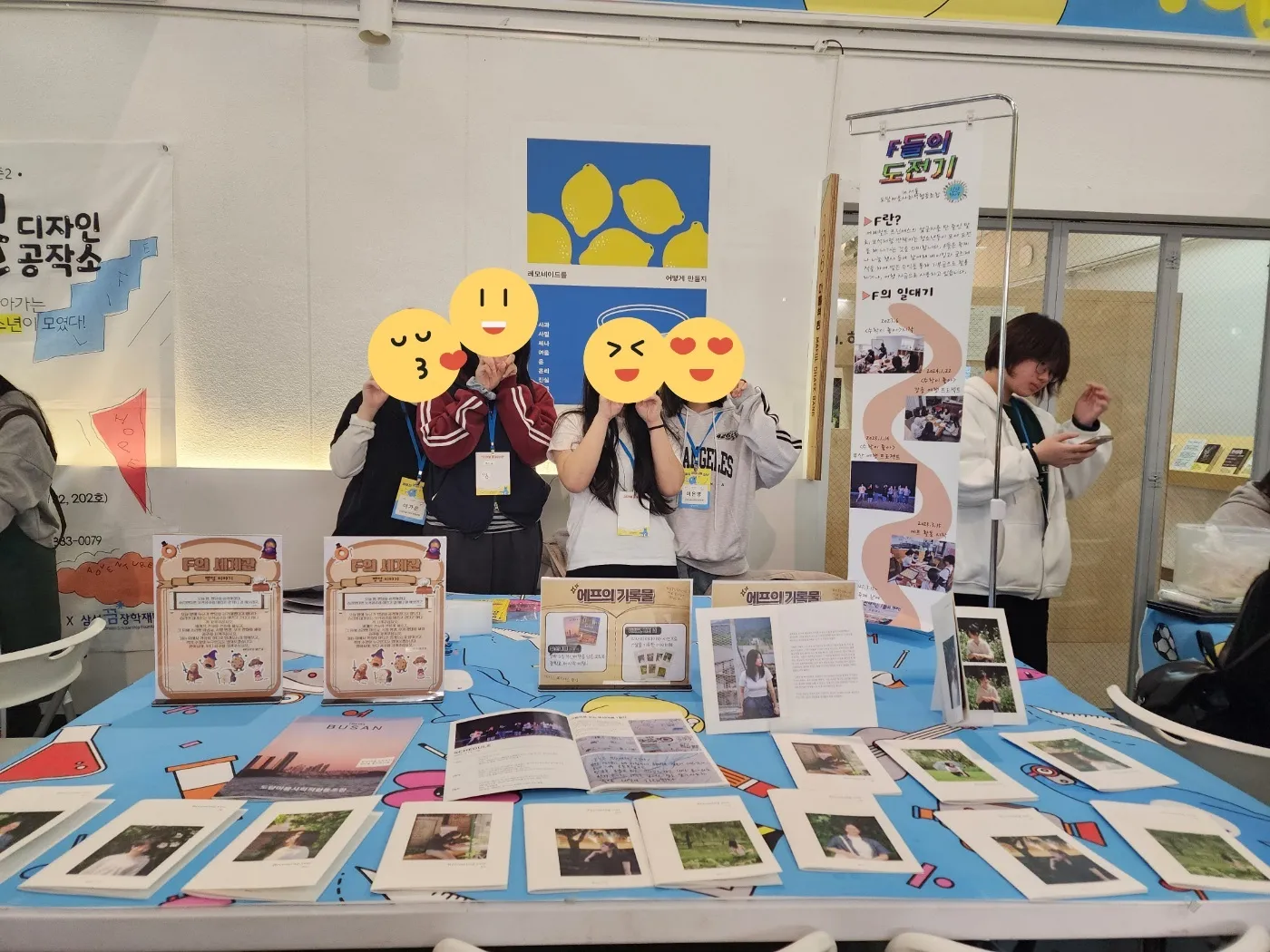 에프에 참여한 이0영 청소년은 “에프 팀을 소개하는 종이 현수막을 직접 만들게 되어 좋은 경험이 되었다. 부스 소개하는 것이 처음에는 힘들고 어려웠지만 여러 번 반복하다 보니 나중에는 능숙하게 할 수 있게 돼서 좀 뿌듯했고, 전국 여러 동아리에서 우리 부스에 많은 관심을 가져주셔서 그동안 한 활동에 많은 보람을 느꼈다. 특히 직접 그려서 제작한 띠부씰과 스티커에 많은 분들이 귀여워해주시고 좋아해주셔서 기분이 매우 좋았다. 다음에 이런 디자인 활동을 할 기회가 있다면 좋겠다.”