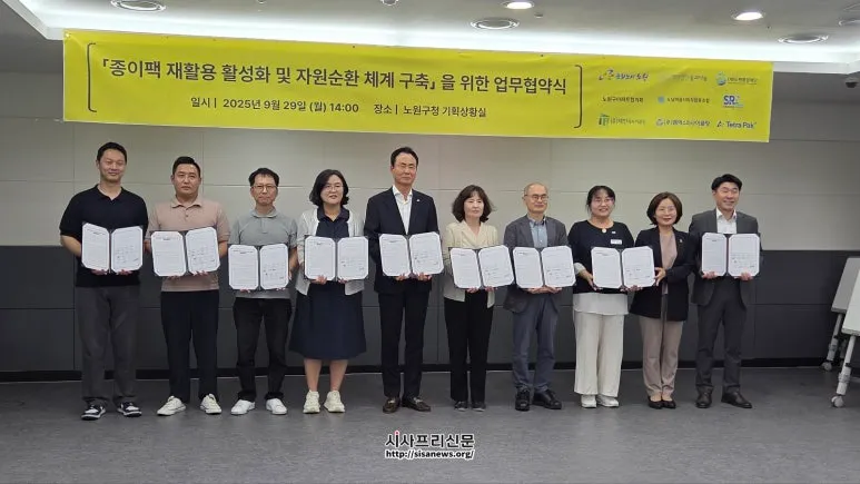 이날 협약을 맺은 9개 기관은 노원구 아파트 50개 단지(4만7529세대 규모)에 종이팩 전용 수거함을 설치해 재활용률을 높이는 시범사업에 참여한다. 도담마을사회적협동조합은 추석연휴 이후 우선 노원구 33개 단지를 시작으로 홍보, 교육 등 주민 인식제고와 참여를 위한 종이팩 분리배출 캠페인을 본격적으로 이어나갈 예정이다.