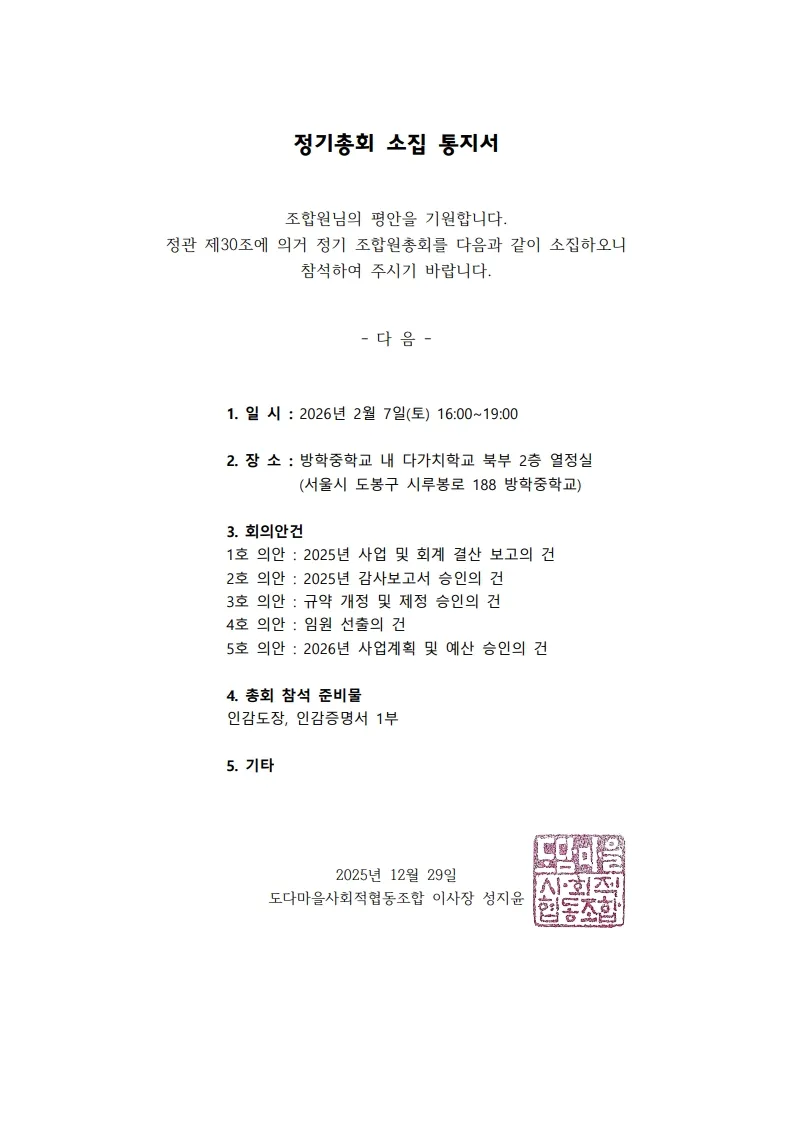 2026년 정기총회 소집 안내